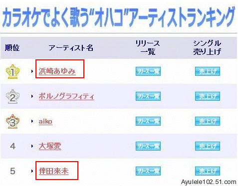 Oricon realizo una encuesta a 300 estudiantes femeninas de colegio sobre que artista prefieren cantar sus canciones en los karaokes. Ayu y Kumi quedaron en el 1er y 5to puesto respectivamente.
