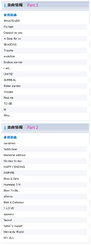 Aquí está las lista de las actuaciones que se dividirá en dos partes, al parecer cada una de las canciones se ha tomado de diferentes Arena/Asia Tours: